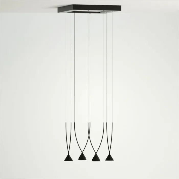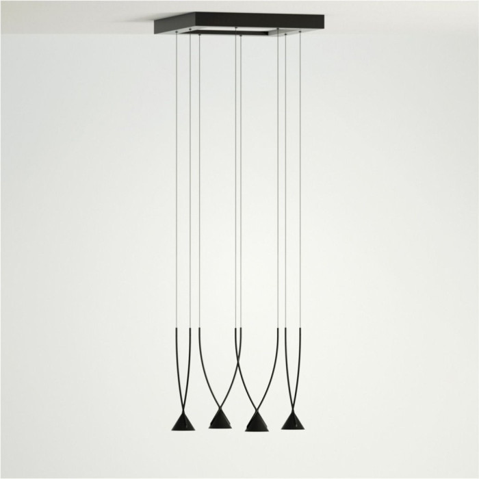 Très moderne et à la ligne épurée et minimaliste, elle est composée de quatre têtes de lampes coniques en aluminium noir suspendues à une rosette de plafond carrée par des câbles bifilaires en aluminium et ABS recyclé, qui renferme la source de lumière LED.
