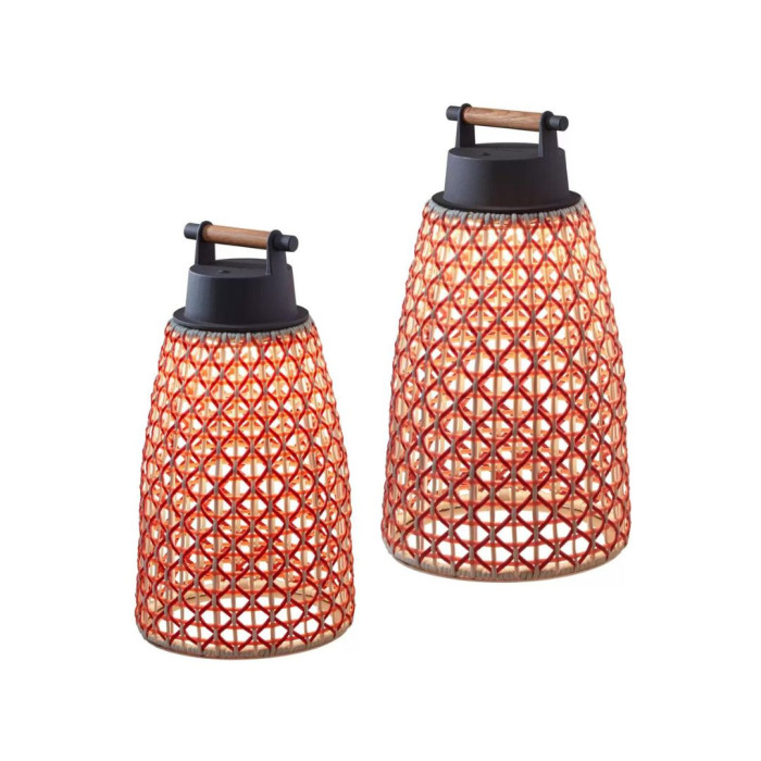 En fibres de polyéthylène avec un socle en métal et un diffuseur en polycarbonate, équipée d'une poignée en bois de teck, elle intégre un interrupteur pour ajuster l'intensité lumineuse sur trois niveaux : 33%, 66% et 100%.