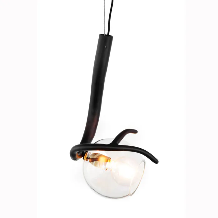 Ersa est un superbe lustre qui se décline avec 1, 2 ou 3 lumières, composé de branches en acier arrangées comme les branches d'un arbre et parsemées de sphères en verre iridescent.