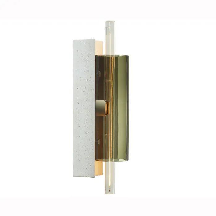Les tubes de verre transparent soufflé confèrent à la collection Overlay un caractère distinctif, tout comme le luminaire en béton unique incrusté d'éclats de verre recyclé de Janštejn Glassworks.