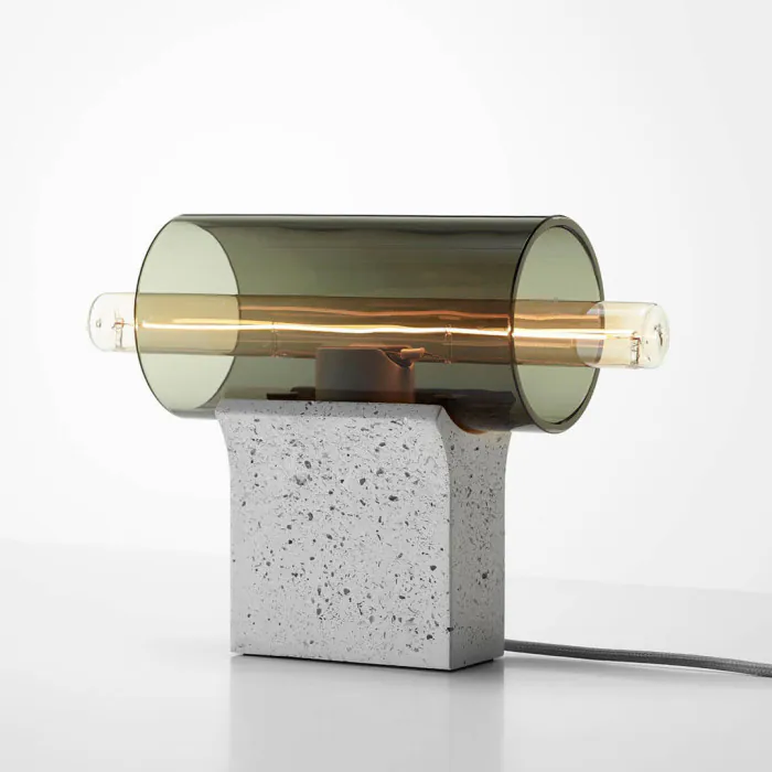 Les tubes de verre transparent soufflé confèrent à la collection Overlay un caractère distinctif, tout comme le luminaire en béton unique incrusté d'éclats de verre recyclé de Janštejn Glassworks.
