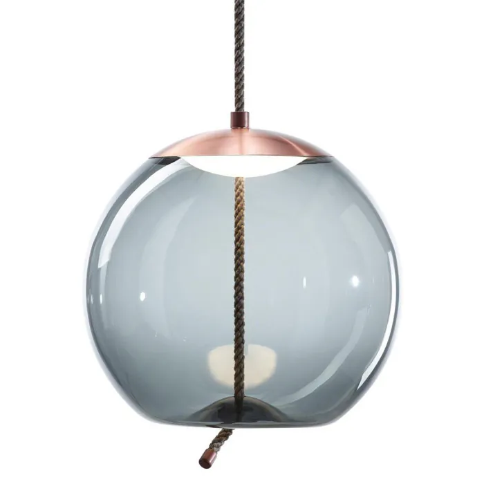 Les lampes à suspendre majestueuses sont composées de verre soufflé de différents coloris au choix, traversées par une grosse corde naturelle tendue, avec un noeud qui se trouve à l’extrémité.