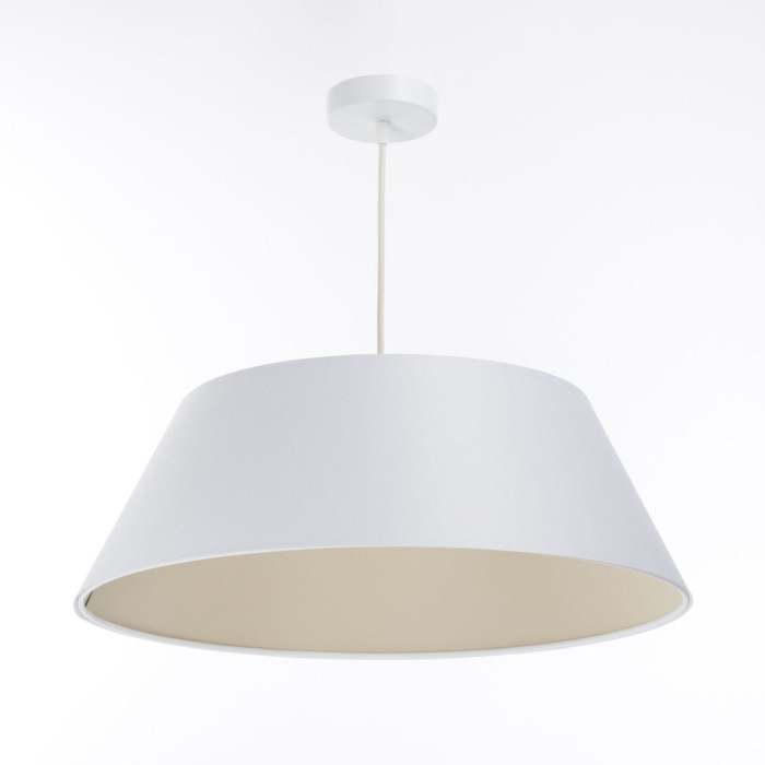 Ce luminaire est constitué d'un abat-jour en tissu blanc sur un support en PVC et l'intérieur est couleur crème.