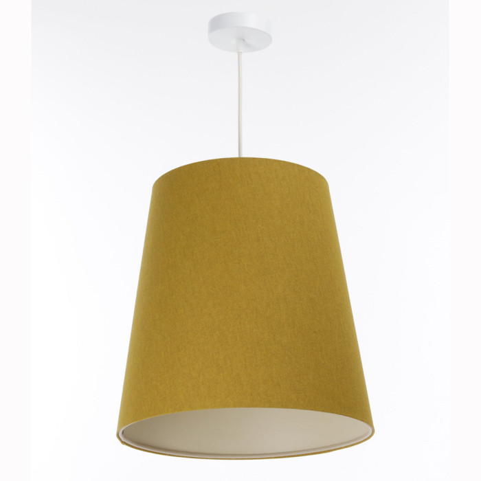 Ce luminaire est constitué d'un abat-jour en tissu moutarde sur un support en PVC et l'intérieur est couleur crème.