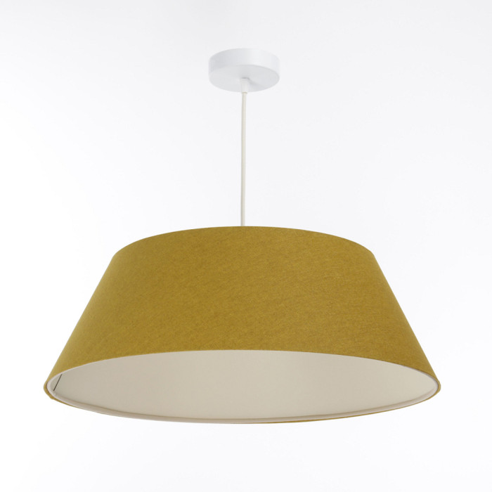 Ce luminaire est constitué d'un abat-jour en tissu moutarde sur un support en PVC et l'intérieur est couleur crème.
