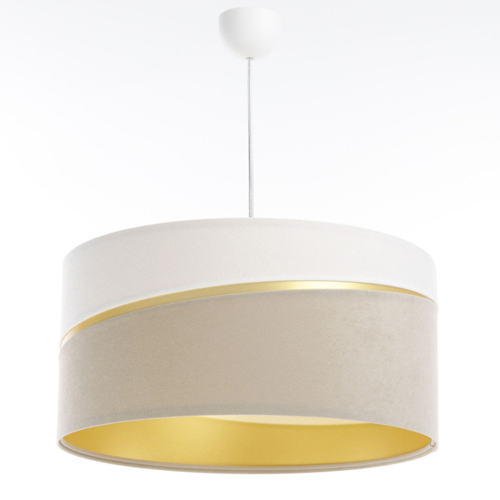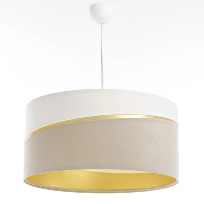 Une partie blanche et une partie beige séparées par un sillon ajouré qui entoure l'abat-jour et qui laisse apparaitre le coloris doré qui constitue l'intérieur de l'abat-jour.