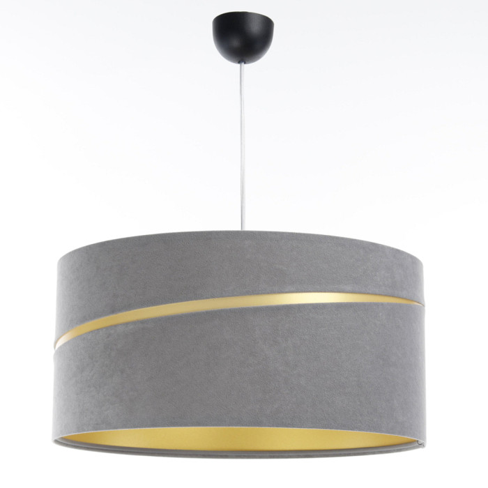 Son abat-jour en PVC est recouvert d'un textile en velour gris et il est décliné en 4 différents diamètres.