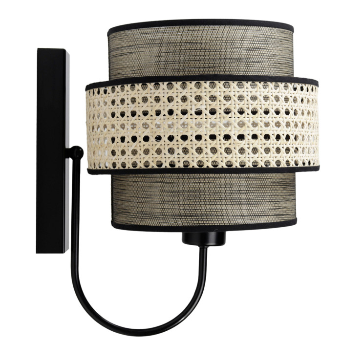 Elle est composée d'un abat-jour en PVC impression mouchettée, scindé en deux parties et entouré par un deuxième abat-jour plus grand, en rotin tréssé.