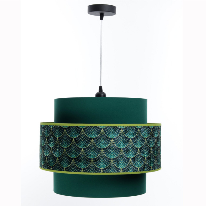 Elle est composée d'un abat-jour en PVC recouvert de tissu vert, scindé en deux parties et entouré par un deuxième abat-jour plus grand, recouvert de tissu en velours imprimé de motifs graphiques et fini par un liseré vert clair.