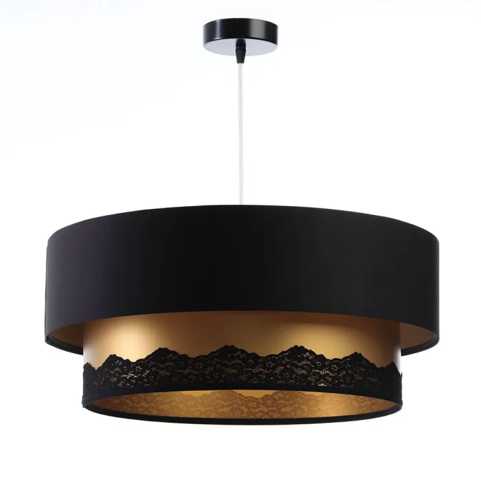 Le plus grand au-dessus est de coloris noir et celui plus petit en dessous (Ø20cm) est doré, avec pour finition un ruban en dentelle.