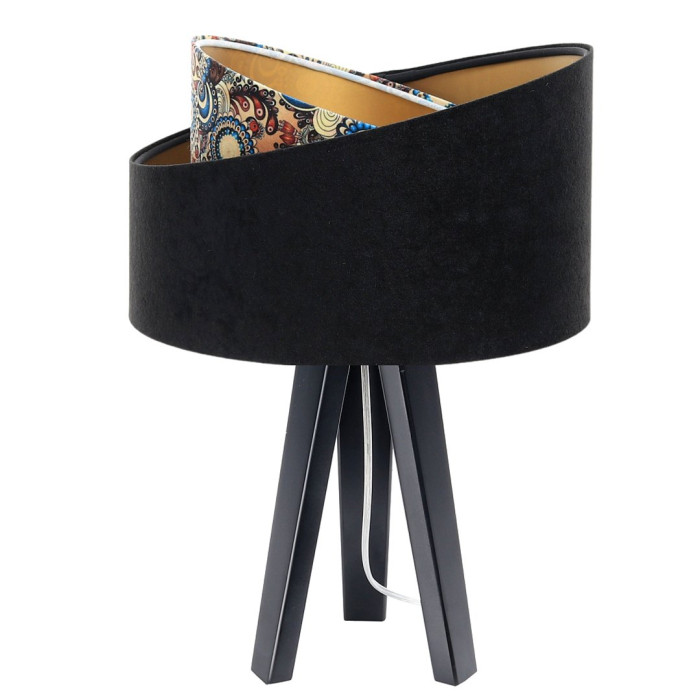 Elle est réalisée avec un abat-jour (Ø30cm/H18cm) asymétrique en PVC recouvert de microfibre noire façon velours et imprimé baroque, intérieur doré.