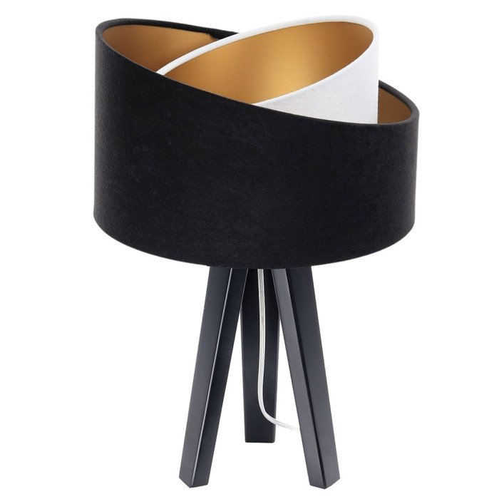 Elle est réalisée avec un abat-jour (Ø30cm/H18cm) asymétrique en PVC recouvert de microfibre noire et blanche façon velours et son intérieur est doré.