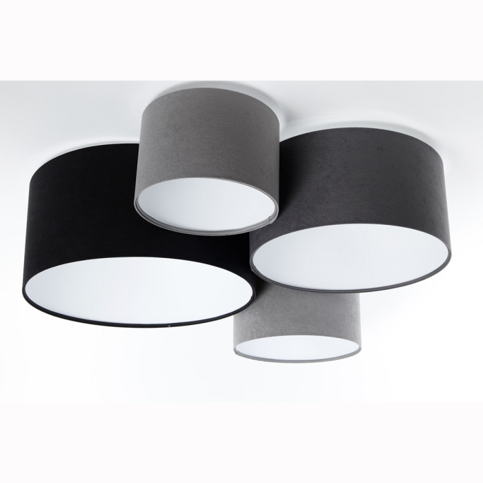 Ce luminaire unique se compose de 4 abats-jour dégradés du noir au gris clair, montés sur un support en PVC, avec un intérieur blanc éclatant.
