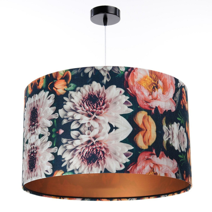 L'abat-jour est en tissu structuré avec des motifs floraux sur fond bleu, appliqué sur du plastique PVC, intérieur cuivre ou noir au choix.