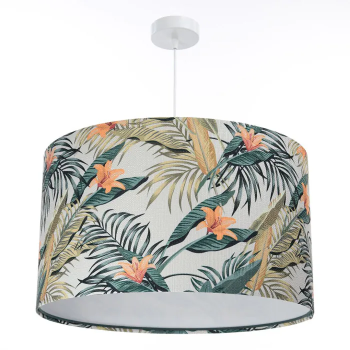 L'abat-jour est en tissu structuré avec des motifs végétaux, appliqué sur du plastique PVC, intérieur gris clair.