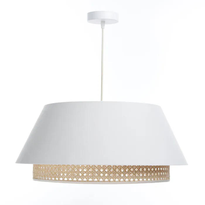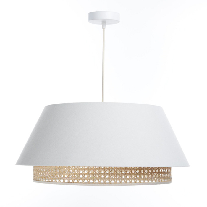 Elle est composée d'un abat-jour en deux matières : la première en velours blanc sur plastique PVC (Ø50cm) et la deuxième en rotin naturel beige tressé avec un liseré blanc en finition(Ø35cm).