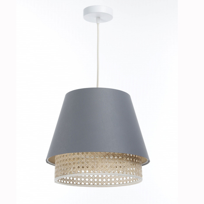 Elle est composée d'un abat-jour en deux matières : la première en satin gris sur plastique PVC (Ø30cm) et la deuxième en rotin naturel beige tressé avec un liseré blanc en finition(Ø20cm).