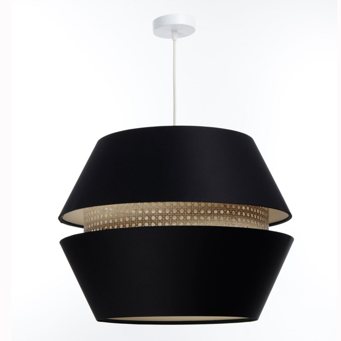 Sa matière principale est en satin noir sur plastique PVC (Ø50cm) avec au milieu un abat-jour en rotin naturel beige tressé (Ø35cm).