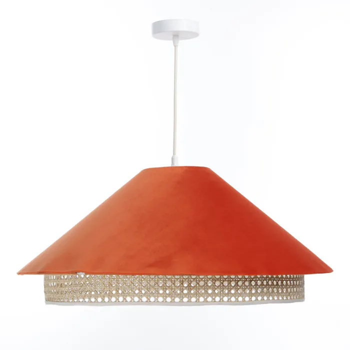 Elle est composée d'un abat-jour en deux matières : la première en velours orange sur plastique PVC (Ø60cm) et la deuxième en rotin naturel beige tressé et un liseré blanc en finition.