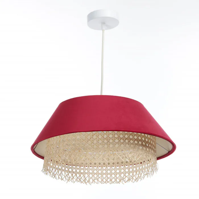 Elle est composée d'un abat-jour en deux matières : la première en satin rouge sur plastique PVC (Ø40cm) et la deuxième en rotin naturel beige tressé et frangé en finition (Ø25cm).