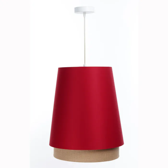 Elle est composée d'un abat-jour en deux matières : la première en satin rouge sur plastique PVC (Ø35cm) et la deuxième en chanvre naturel beige (Ø25cm).