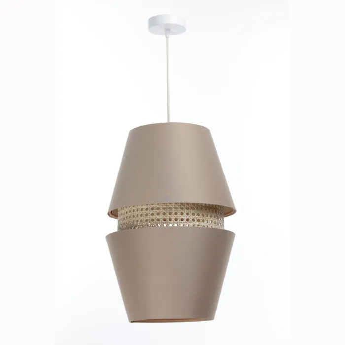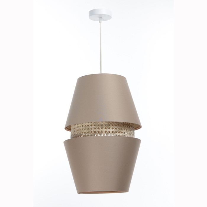Sa matière principale est en satin taupe sur plastique PVC (Ø30cm) avec au milieu un abat-jour en rotin naturel beige tressé (Ø20cm).