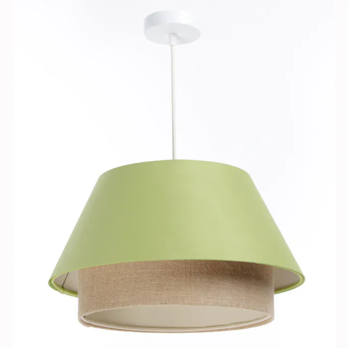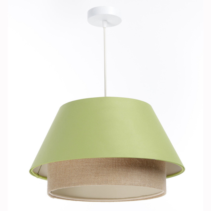 Elle est composée d'un abat-jour en deux matières : la première en satin vert pistache sur plastique PVC (Ø40cm) et la deuxième en chanvre naturel (Ø25cm).