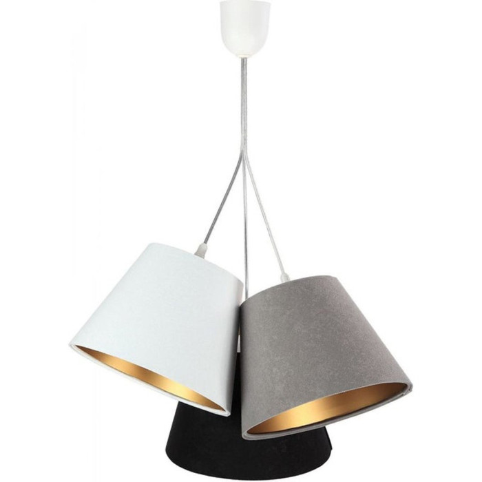 Elle est composée de 3 abats-jour en velours noir, blanc et gris avec au choix l'intérieur blanc, argenté ou doré.