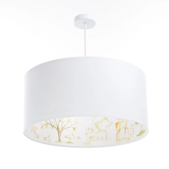 Cette suspension en textile velours blanc sur support en PVC est ornée d'une impression en latex écologique d'adorables créatures pastels dessinées à l'intérieur de l'abat-jour qui apportent une touche de féerie à la décoration de la chambre.