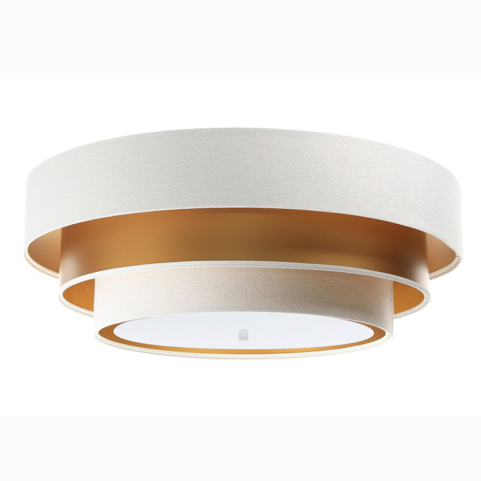 Il est composé de trois abats-jour en PVC posés les uns sur les autres, recouverts de microfibre en velours blanc sur deux des trois abats-jour, d'un film doré sur l'abat-jour du milieu avec un liseré blanc, et d'un dessous doré pour les trois pièces.