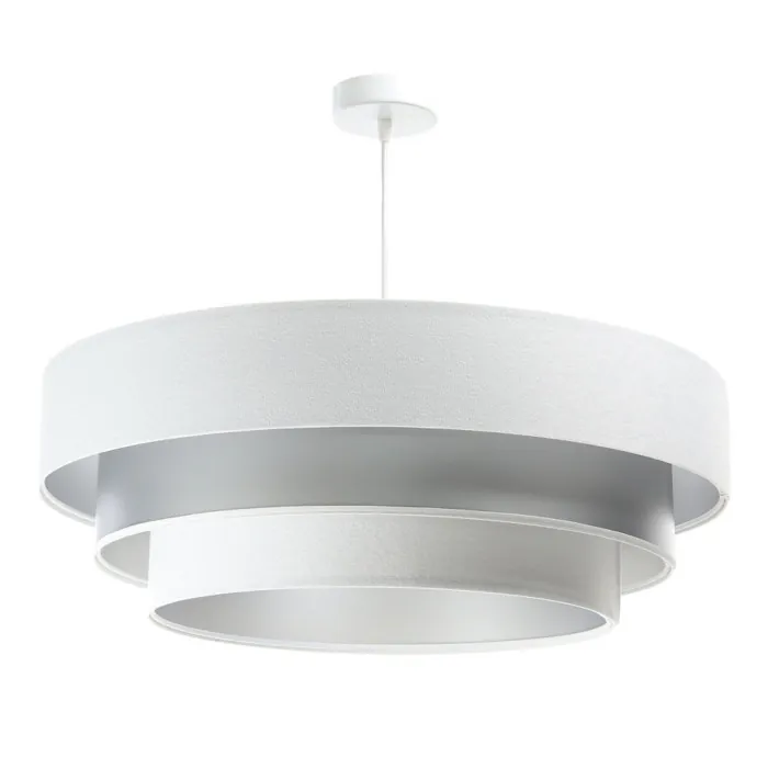 Elle est composée de trois abat-jours en PVC posés les uns sur les autres, recouverts de microfibre en velours blanc sur deux des trois abat-jours, d'un film argenté sur l'abat-jour du milieu avec un liseré blanc, et d'un dessous argenté pour les trois pièces.