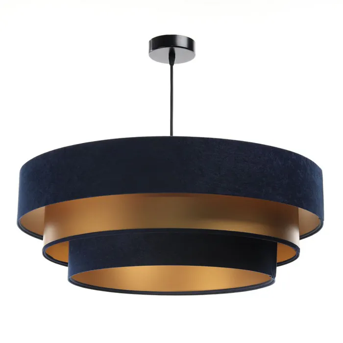 Elle est composée de trois abat-jours en PVC posés les uns sur les autres, recouverts de microfibre en velours bleu marine sur deux des trois abat-jours, d'un film doré sur l'abat-jour du milieu avec un liseré bleu marine, et d'un dessous doré pour les trois pièces.