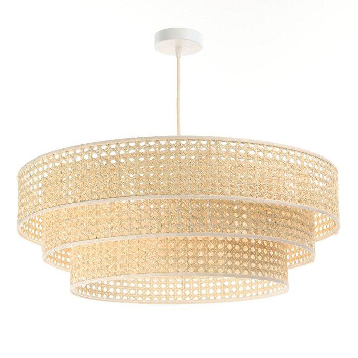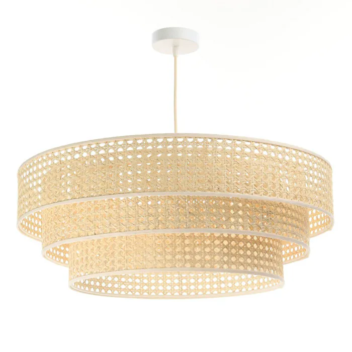 Elle est composée de 3 abats-jour posés l'un sur l'autre en fibres de palmier rotang naturel, le tout fini avec des liserés.