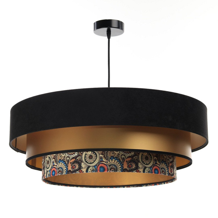 Elle est composée de trois abat-jours en PVC posés les uns sur les autres, recouverts de microfibre en velours noir, d'un film doré et d'un autre aux motifs colorés pop, recouvert d'un fond doré.