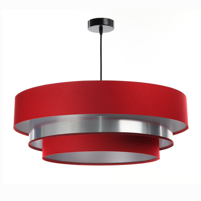 Elle est composée de trois abat-jours en PVC posés les uns sur les autres, recouverts de microfibre en satin rouge sur deux des trois abat-jours, d'un film argenté sur l'abat-jour du milieu avec un liseré rouge, et d'un dessous argenté pour les trois pièces.