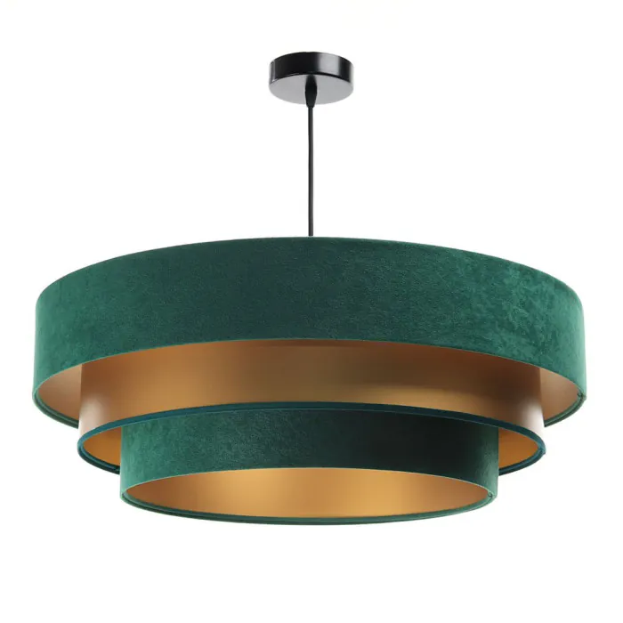 Elle est composée de trois abat-jours en PVC posés les uns sur les autres, recouverts de microfibre en velours vert sur deux des trois abat-jours, d'un film doré sur l'abat-jour du milieu avec un liseré vert, et d'un dessous doré pour les trois pièces.