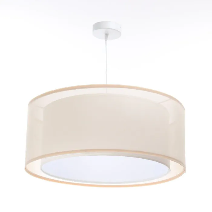 Elle est composée de 2 abats-jour posés l'un autour de l'autre, un blanc et l'autre crème translucide.