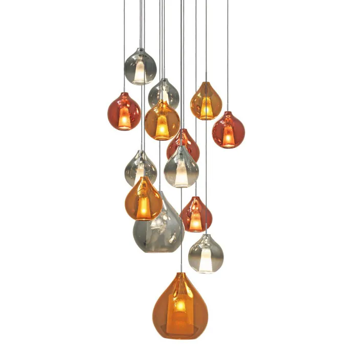 Suspension Circe 14 lumières, au look très contemporain, de la marque française Concept Verre. Cette suspension design est composée de 14 diffuseurs en verre soufflé de différentes tailles et de plusieurs coloris au choix, fixés sur un socle chromé Ø60cm: