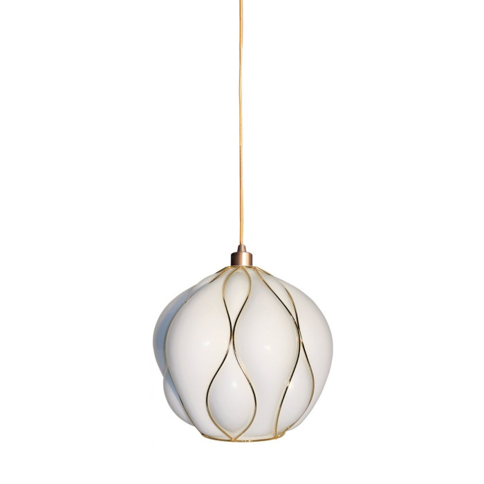Elle se compose d'un diffuseur Ø34cm/H33cm, blanc opaque ou fumé, fabriqué en Italie dans la tradition des maîtres verriers et pris dans une cage en laiton.