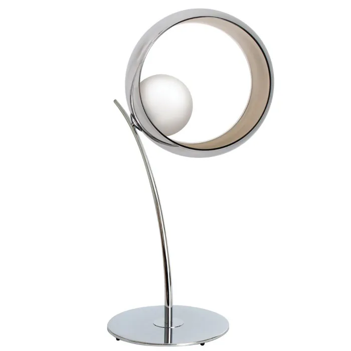 Elle est composée d'un large anneau de verre incurvé disponible dans différentes finitions et dans lequel est disposé une sphère de verre blanche qui accueille l'ampoule, le tout sur un corps en chrome, avec câble transparent de 2M.