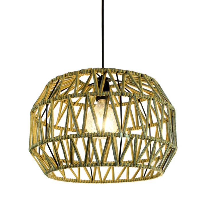Abat-jour en cordon naturel minutieusement tressé, structure en métal noir et câble électrique noir.