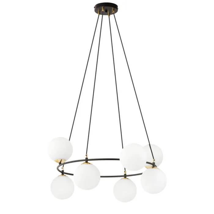 Fabriquée avec un socle circulaire en acier noir, elle s'adapte parfaitement aux 7 abats-jour de globe en verre thermolaqués opal irrégulièrement espacés, qui soulignent son caractère moderne et élégant.