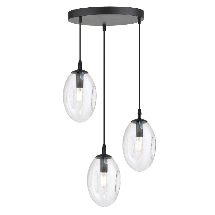 La suspension Astral Emibig est fabriquée avec un support en métal noir agrémenté de 3 abat-jour en verre thermolaqués transparent.