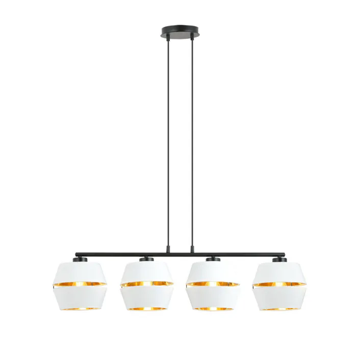 Fabriquée en acier et tissu, ses 4 abats-jour blancs Ø15cm, originaux, car ouverts en leur milieu, laissent apparaitre un intérieur doré qui confère à la pièce un caractère unique.