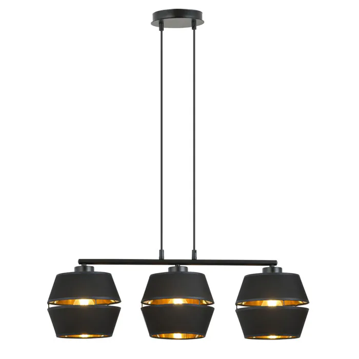 Fabriquée en acier et tissu, ses 3 abats-jour noirs, originaux car ouverts en leur milieu, laissent apparaitre un intérieur doré qui confère à la pièce un caractère unique.