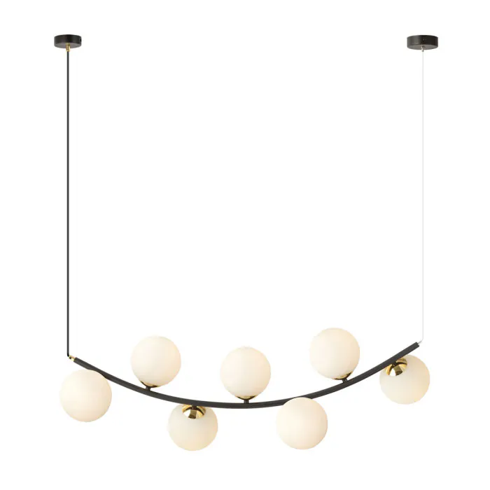 Fabriquée en acier noir, les 7 abats-jour blancs opale sont posés irrégulièrement sur une tige arrondie, soulignant son style moderne et élégant.