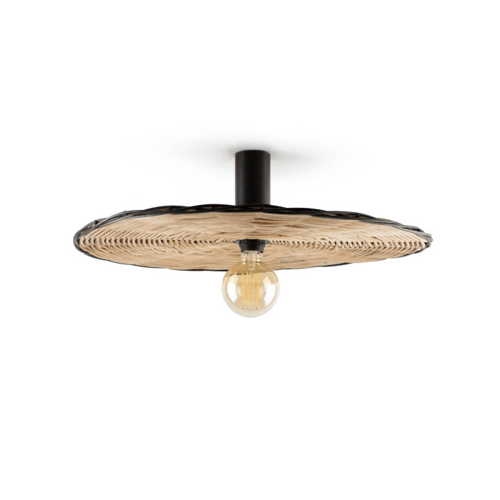 Fabriquée avec un corps en acier noir et un abat-jour en rotin.