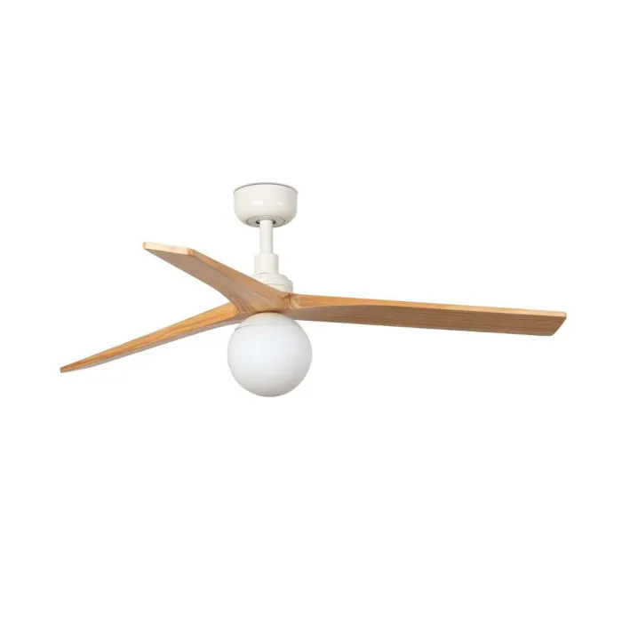 Le ventilateur de plafond Klim taille M, de la marque Faro, se distingue par son design élégant et contemporain, associant une structure blanche à des pales en bois finition chêne pour un rendu chaleureux et sophistiqué.