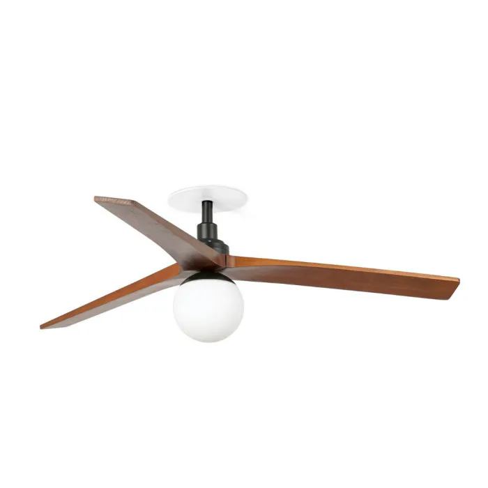 Le ventilateur de plafond Klim taille M, de la marque Faro, se distingue par son design élégant et contemporain, associant une structure noire à des pales en bois finition noyer pour un rendu chaleureux et sophistiqué.