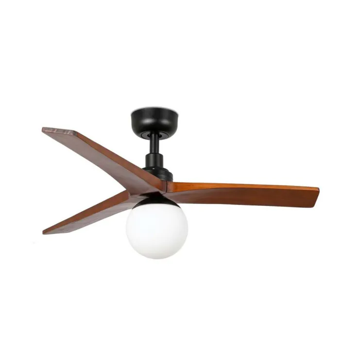 Le ventilateur de plafond Klim taille S, de la marque Faro, se distingue par son design élégant et contemporain, associant une structure noire à des pales en bois finition noyer pour un rendu chaleureux et sophistiqué.
